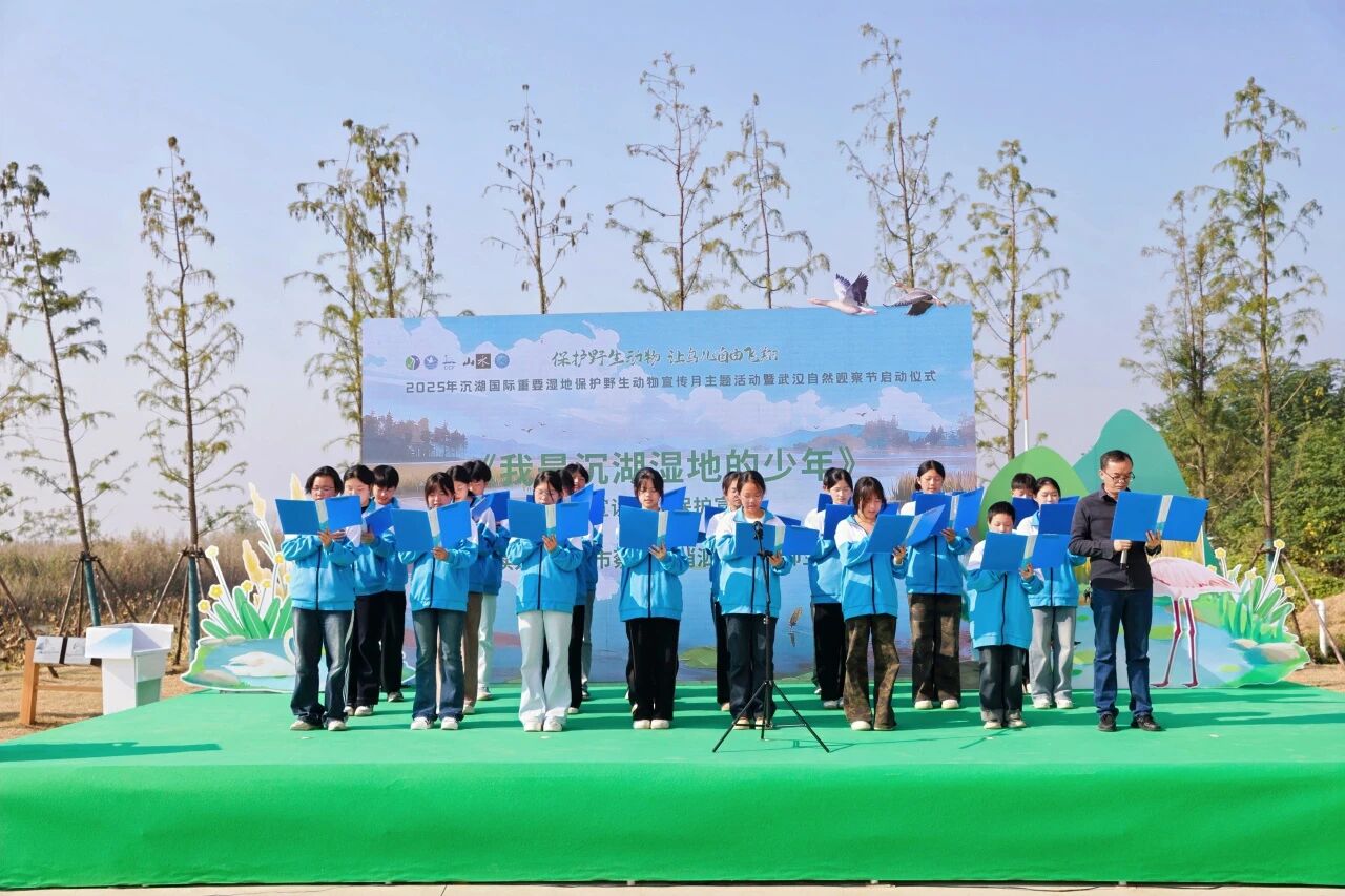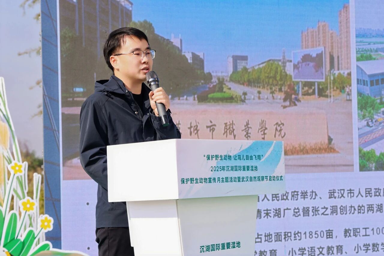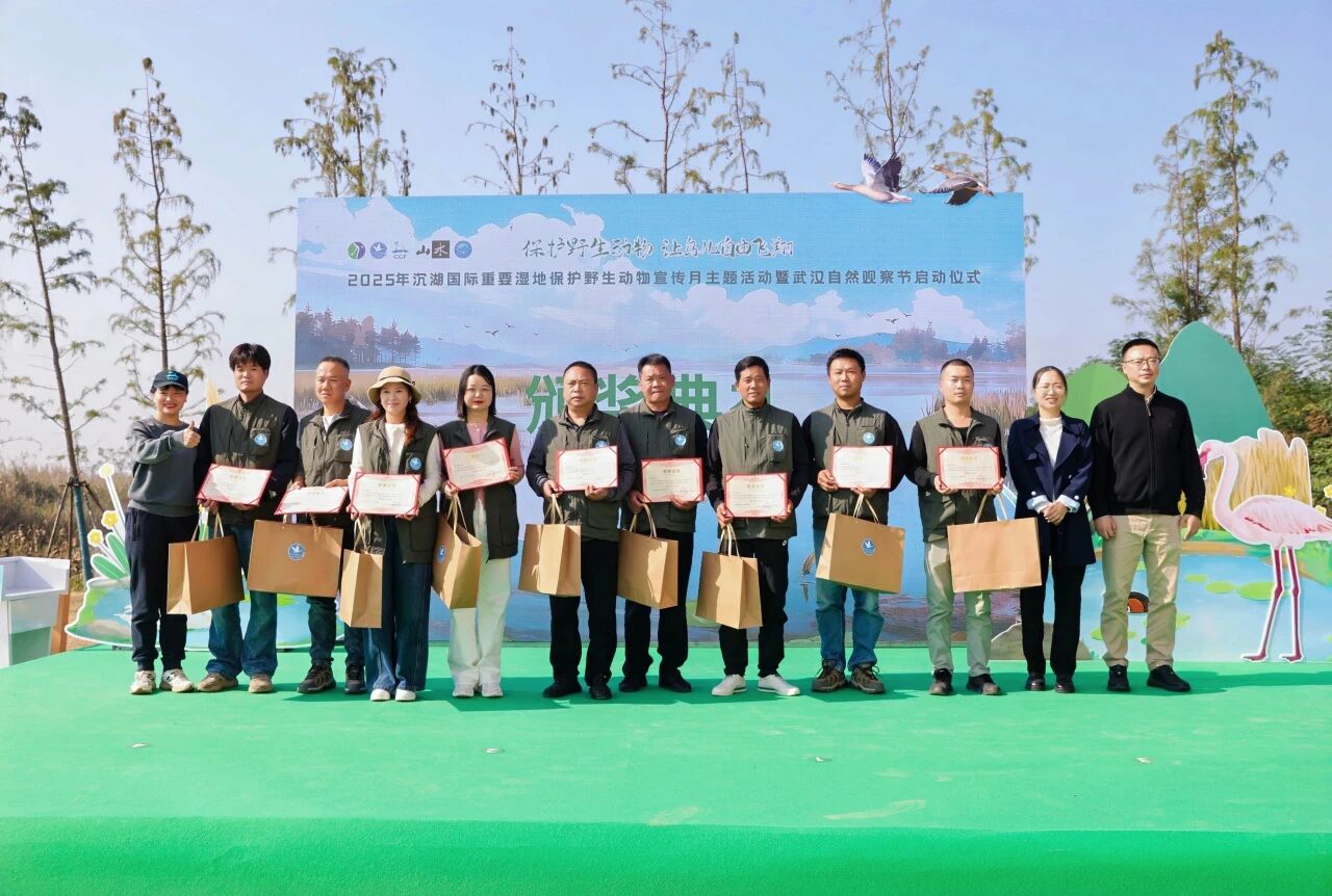 上午的启动仪式环节丰富而有序,武汉市蔡甸区沉湖湿地自然保护区管理局负责人邝德喜局长的致辞展现了沉湖保护的坚定决心。在”我与沉湖的故事”分享环节,七壕村村民代表刘天永讲述了与湿地世代相依的生命记忆,生态摄影师魏斌通过镜头展现了沉湖四季流转的生态之美。武汉城市职业学院教师方赛军分享了将自然智慧融入课堂的教育实践。随后,消泗乡中学的师生代表铿锵有力地宣读了《我是沉湖湿地的少年》湿地保护宣言,展现了年轻一代守护生态的坚定信念。”最美巡护员”颁奖礼则通过一段段纪实短片,致敬了平凡岗位上的坚守与付出。湖北省长江生态保护基金会秘书长黄学清介绍了本届自然观察节的整体规划和愿景。武汉光谷山水公益基金会理事长史湘莹从山水在城市生物多样性保护的实践出发,分享了发起此次自然观察节的初衷。
