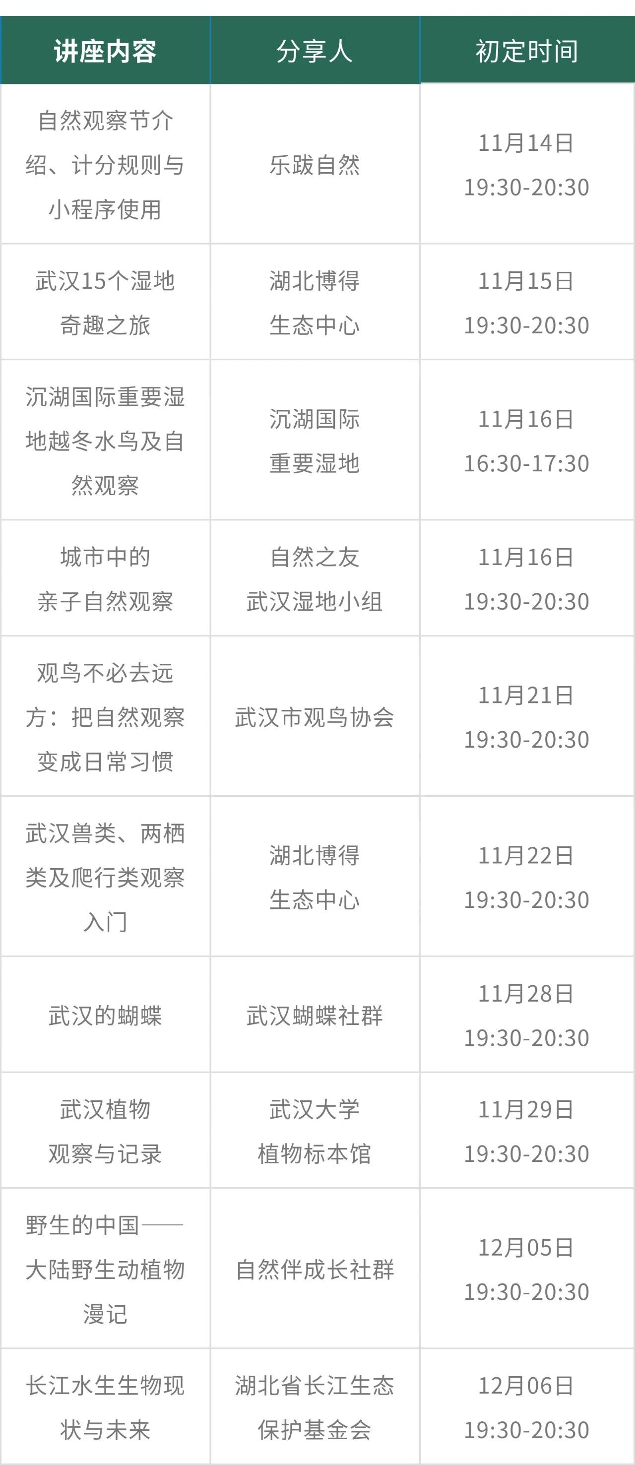 接下来,武汉自然观察节还将会开展一系列的线下活动,比如11月22日两场志愿者线下培训;11月23日至11月30日,四场公众自然观察导赏活动;11月底,月湖公园自然观察挑战赛;12月13日唐蔡社区自然观察挑战赛;12月20日的成果分享会等。加入官方微信群,了解更多的活动信息。