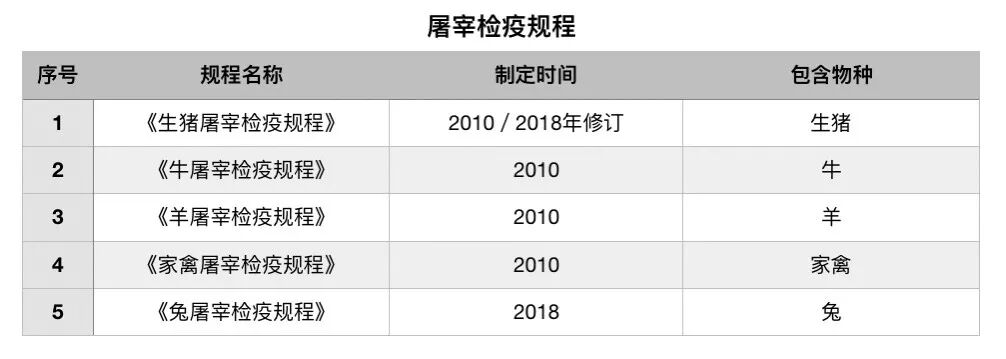 除此之外,对于涉及到肉类制品的,农村农业部目前还出台了生猪、牛、羊、家禽、兔五个《屠宰检验规程》。