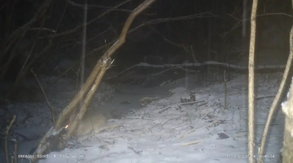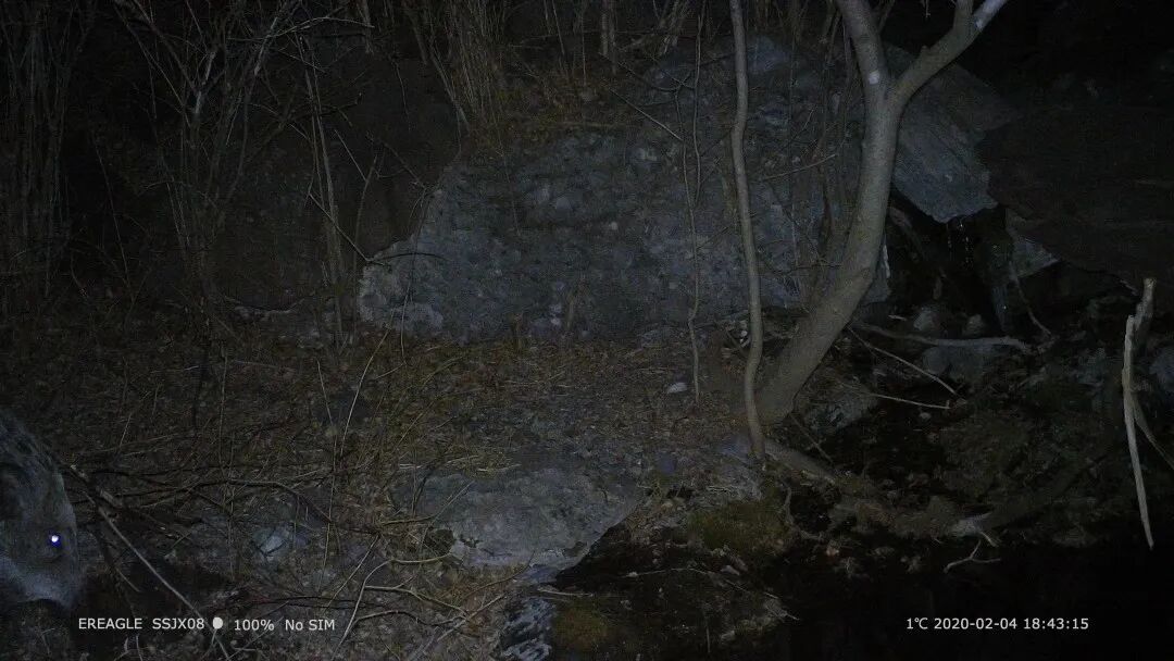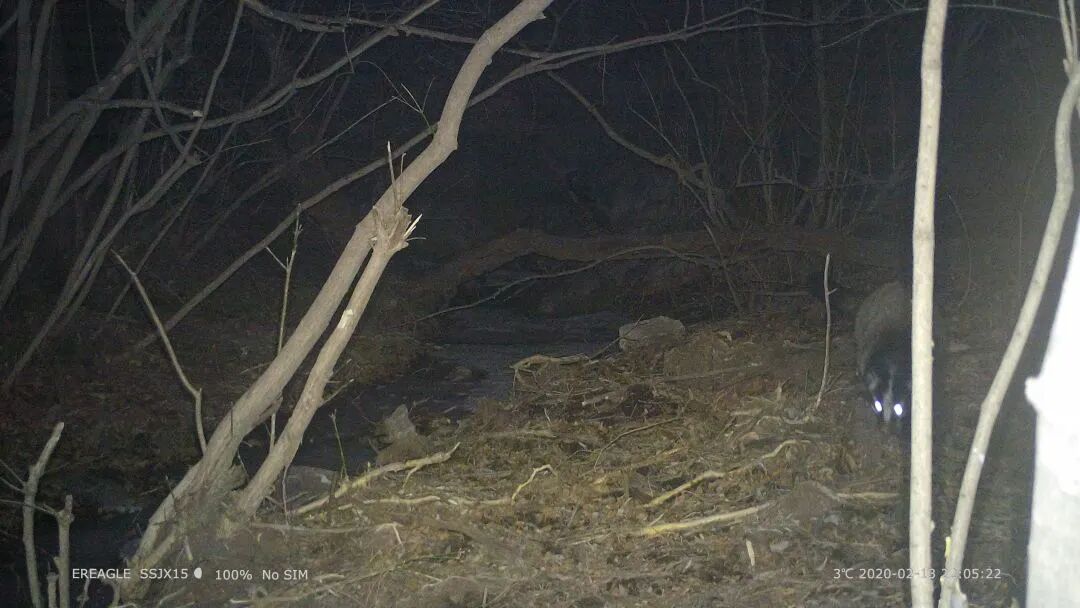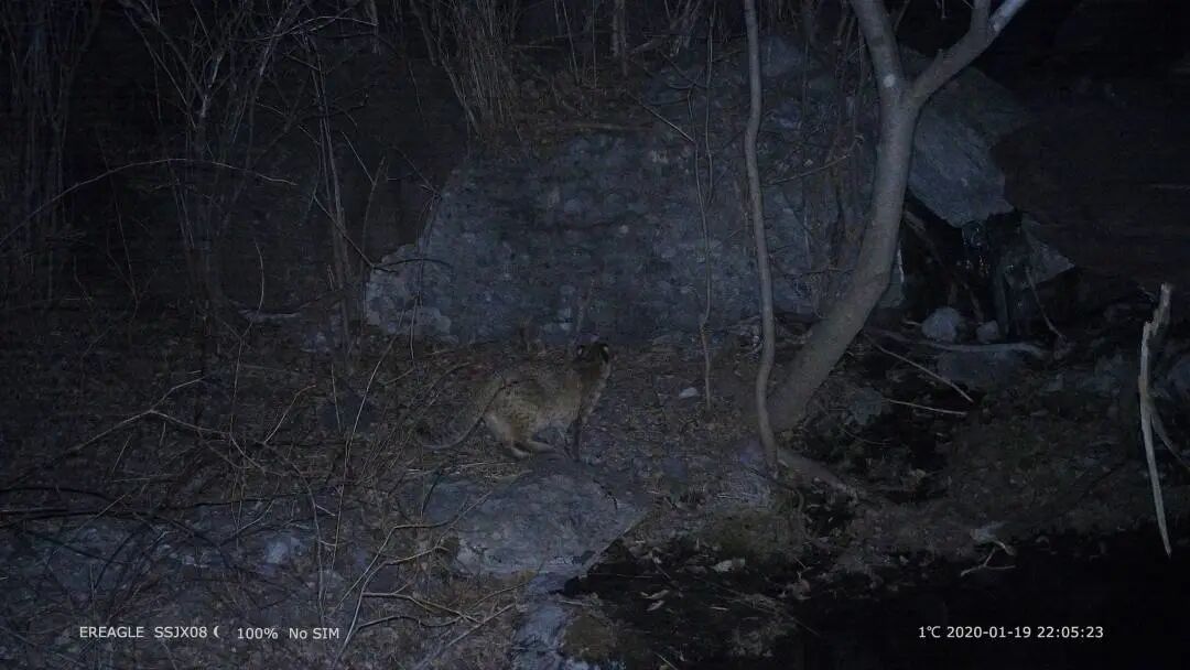 对于豹猫这样的食肉动物,要度过冬天必须解决口粮问题。蒙古兔是豹猫的潜在猎物之一。林场的孙师傅说:“有兔子的地方就能拍到豹猫,豹猫要抓兔子吃”。我们在山梁上的一个兔子屎球球巨多的兽径上放了红外相机,想拍到豹猫和蒙古兔的踪迹,甚至贪心地想拍到抓捕的画面……遗憾这次还暂时上不去那个位点(期待一下)。不过这次有2台相机拍到了4次蒙古兔,其中一只蒙古兔跨过水的画面,真的是身姿矫健快到模糊……