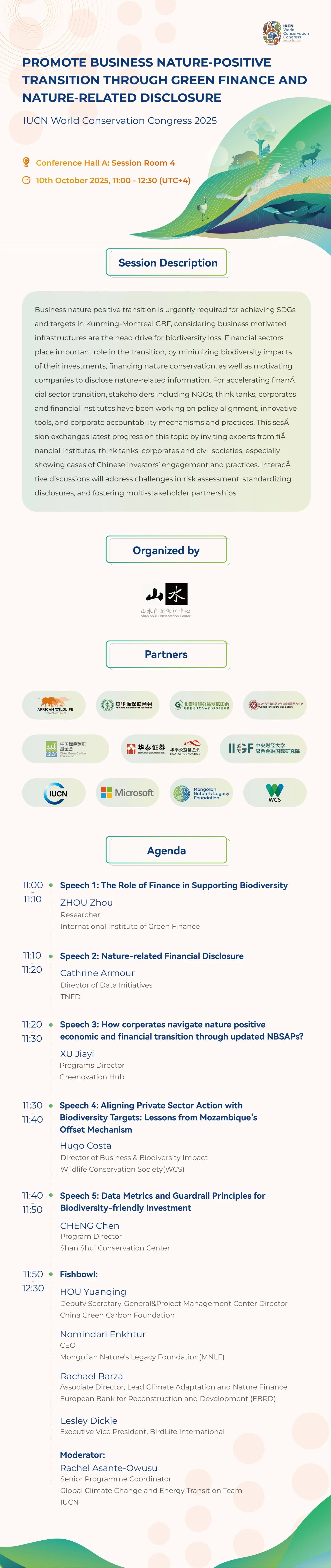 为实现可持续发展目标及“昆蒙框架”行动目标,亟需推动商业部门的积极转型。金融部门在此转型中扮演关键角色,具体行动包括通过降低投资对生物多样性的影响、为自然保护提供融资支持、以及激励企业披露自然相关信息等。为加速金融部门转型,政府、企业及金融机构、非政府组织、智库等利益相关方正共同推进政策协调、创新工具开发以及企业问责机制与实践。本环节特邀金融机构、智库、企业及社会组织等交流最新进展,展示全球金融机构的参与实践案例。本会议也被纳入此次IUCN商业峰会(Business Summit)日程中。