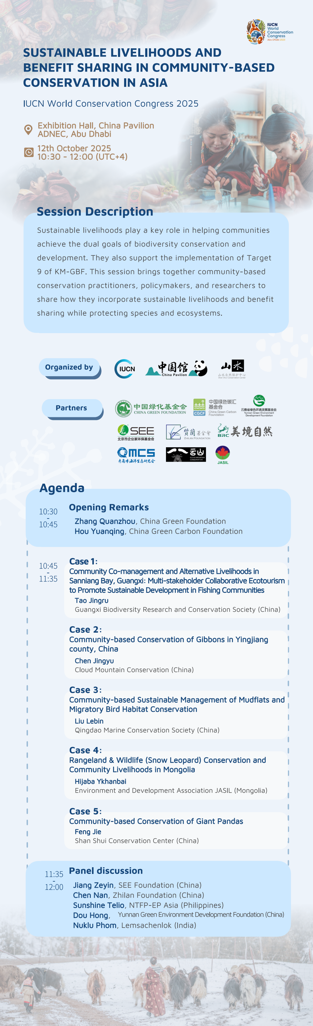 可持续生计在帮助社区实现生物多样性保护与发展的双重目标方面发挥着关键作用,同时支持“昆蒙框架”行动目标9的落实。本环节汇聚社区保护实践者、政策制定者及研究人员,共同探讨如何在保护物种与生态系统的同时,融入可持续生计与惠益共享机制。
