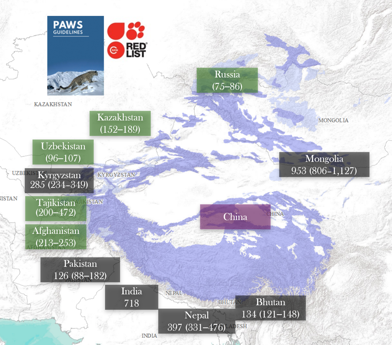俄罗斯:通过汇总2022-2023年期间在俄罗斯阿尔泰共和国、图瓦共和国、克拉斯诺亚尔斯克边疆区、布里亚特共和国等雪豹分布区的雪豹种群评估结果,俄罗斯全境雪豹种群数量为75-86只。