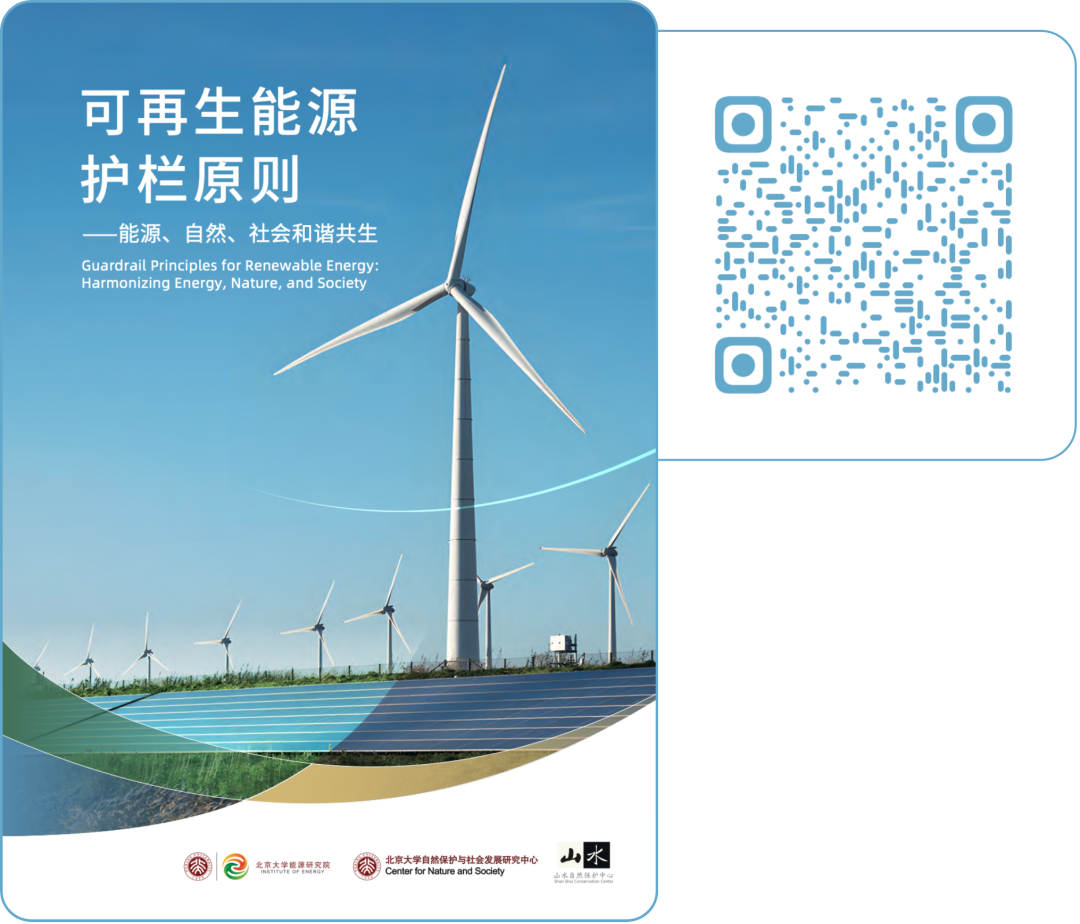 《可再生能源护栏原则——能源、自然、社会和谐共生》报告(以下简称“报告”)由山水自然保护中心、北京大学自然保护与社会发展研究中心和北京大学能源研究院合作完成。报告深入剖析风电、光伏项目从原材料开采到退役回收的全过程,系统评估其对生态环境和社会的影响,梳理国内外在绿色供应链、项目审批、退役回收等方面的最新政策,提出了旨在引导行业可持续发展的“护栏原则”,为我国可再生能源企业在全球产业链中提升竞争力提供战略参考。我们希望通过这份报告,为行业提供一套框架,以平衡能源发展与生态保护,实现真正的可持续发展。