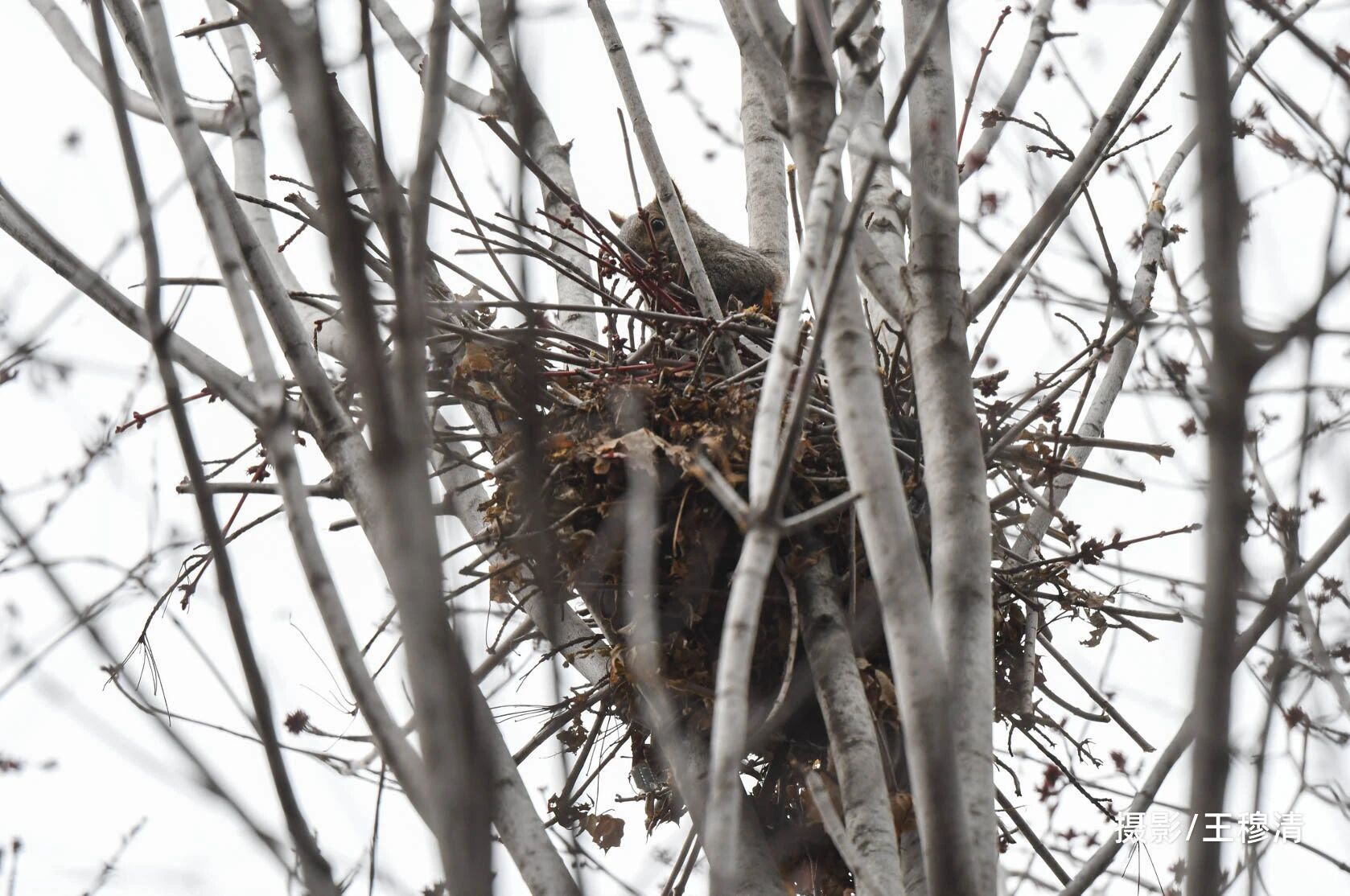 第四,如果能够四季连续观察,可以注意随着时间的推移,痕迹本身和物候有什么变化。最后,观察动物制造痕迹的过程,它可以帮助你确认某个痕迹确实是你所判断的动物。比如下图是一个松鼠窝。以喜鹊举例对比,喜鹊窝的外围用很多光秃秃的树枝,松鼠的则更多是带着枯叶的完整树枝,并且“就树取材”,银杏树上用银杏树叶,在水杉树上用水杉树叶,悬铃木树上又用悬铃木树叶……