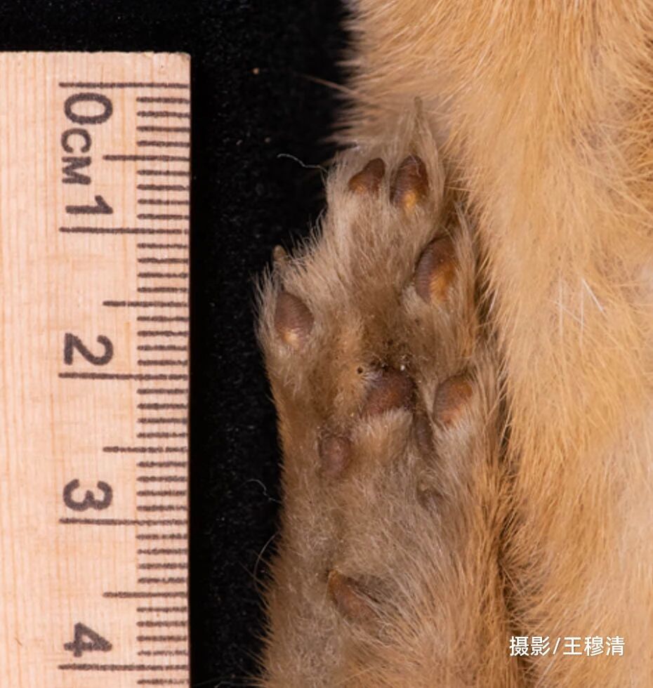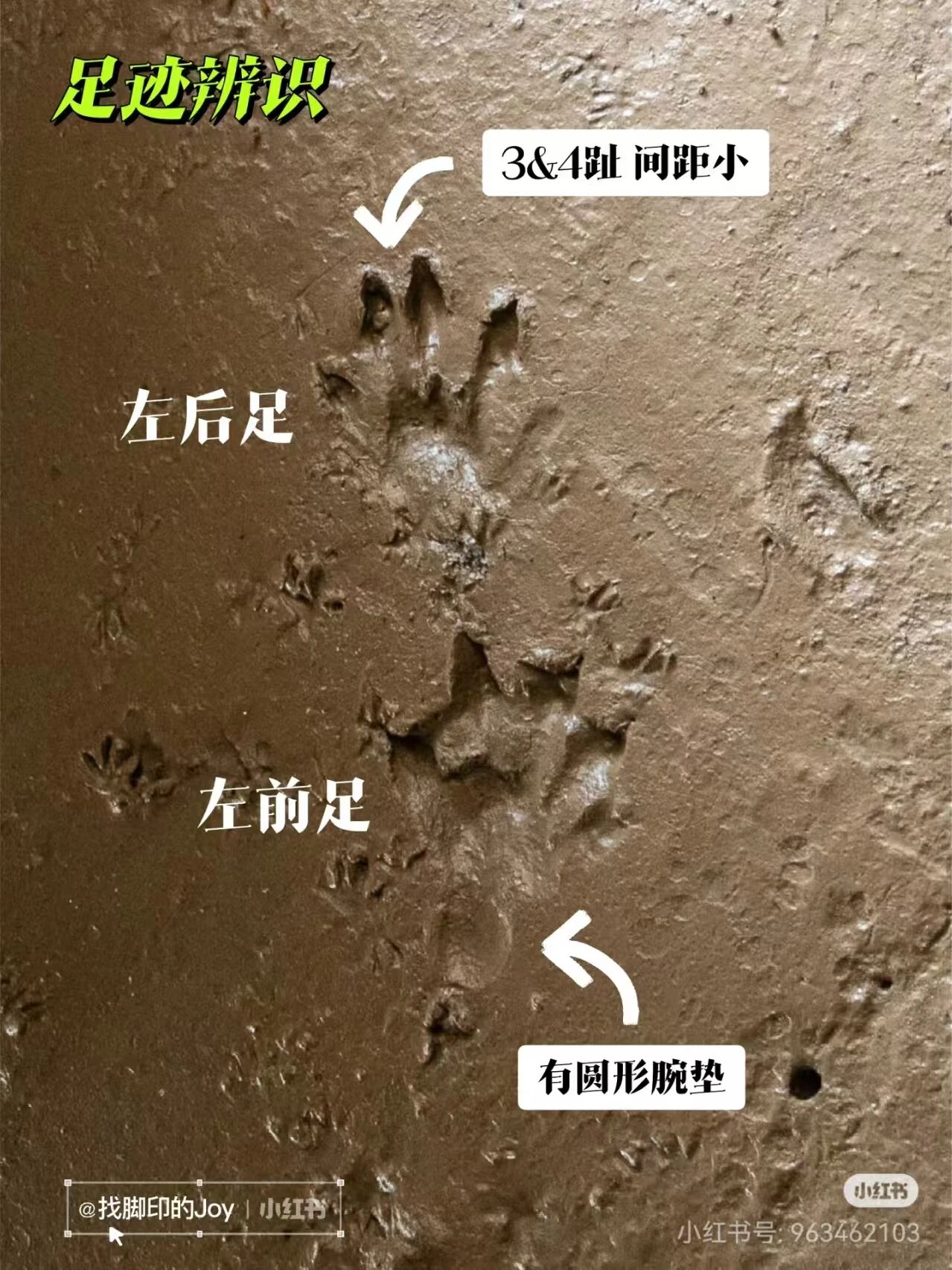 狗獾右前足的痕迹 ©小红书“找脚印的Joy”最后我们来说说如何区分猫科和犬科的脚印,猫狗的脚印是我们最容易接触到的,但误判率其实相当高。猫科和犬科的足印中都是四个趾垫、一个掌垫。如果大家周围有猫猫狗狗,可以把它们抱起来看一下——前足其实有五趾,但内侧的趾一已经退化为一个小突起,而后脚的已经彻底退化了。一个常被提到的区别是猫科动物能收缩爪子,而犬科不能,所以犬科的脚印有爪尖的痕迹。但要注意的是,在硬质或浅层地面上,犬科的爪印也可能不明显甚至不印出,猫科的爪也有可能在需要更大的抓地力时伸出,因此不能单凭有无爪印判断。