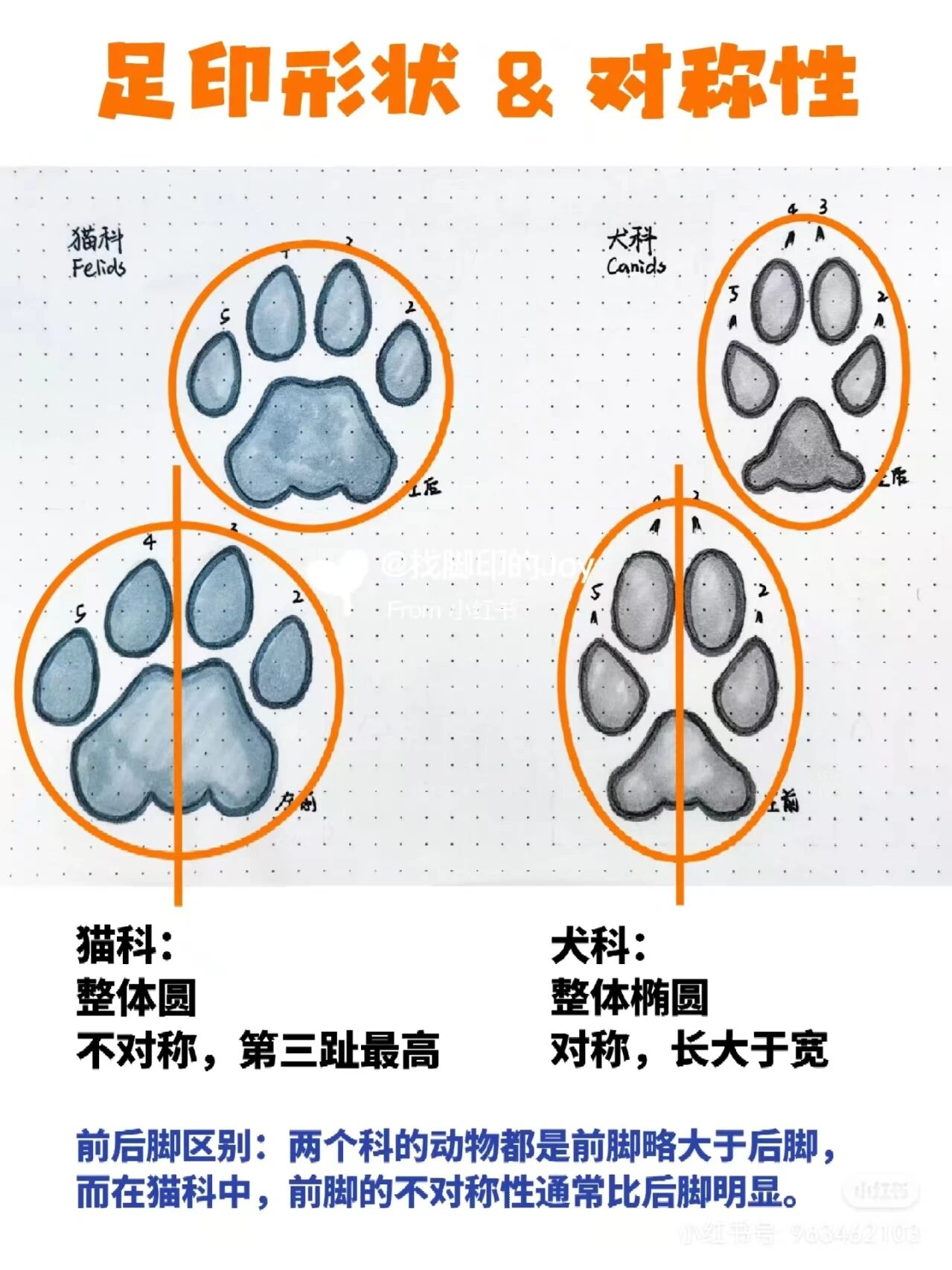 • 对称性:猫科的脚印不对称,趾三最高,犬科的脚印相对比较对称;