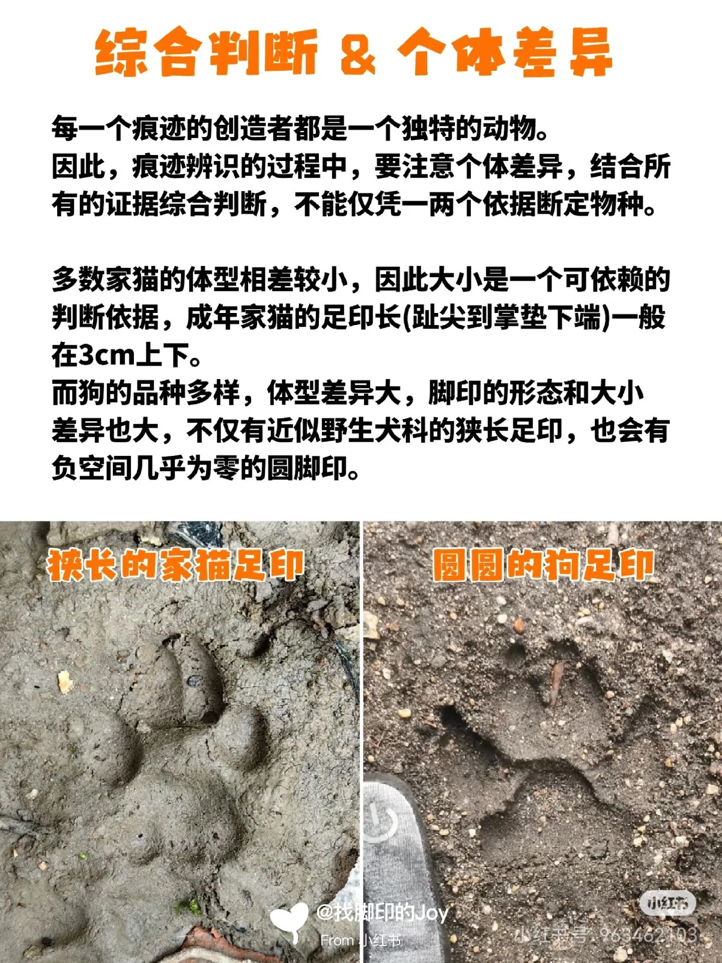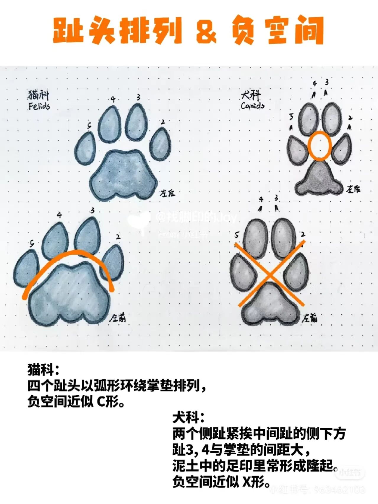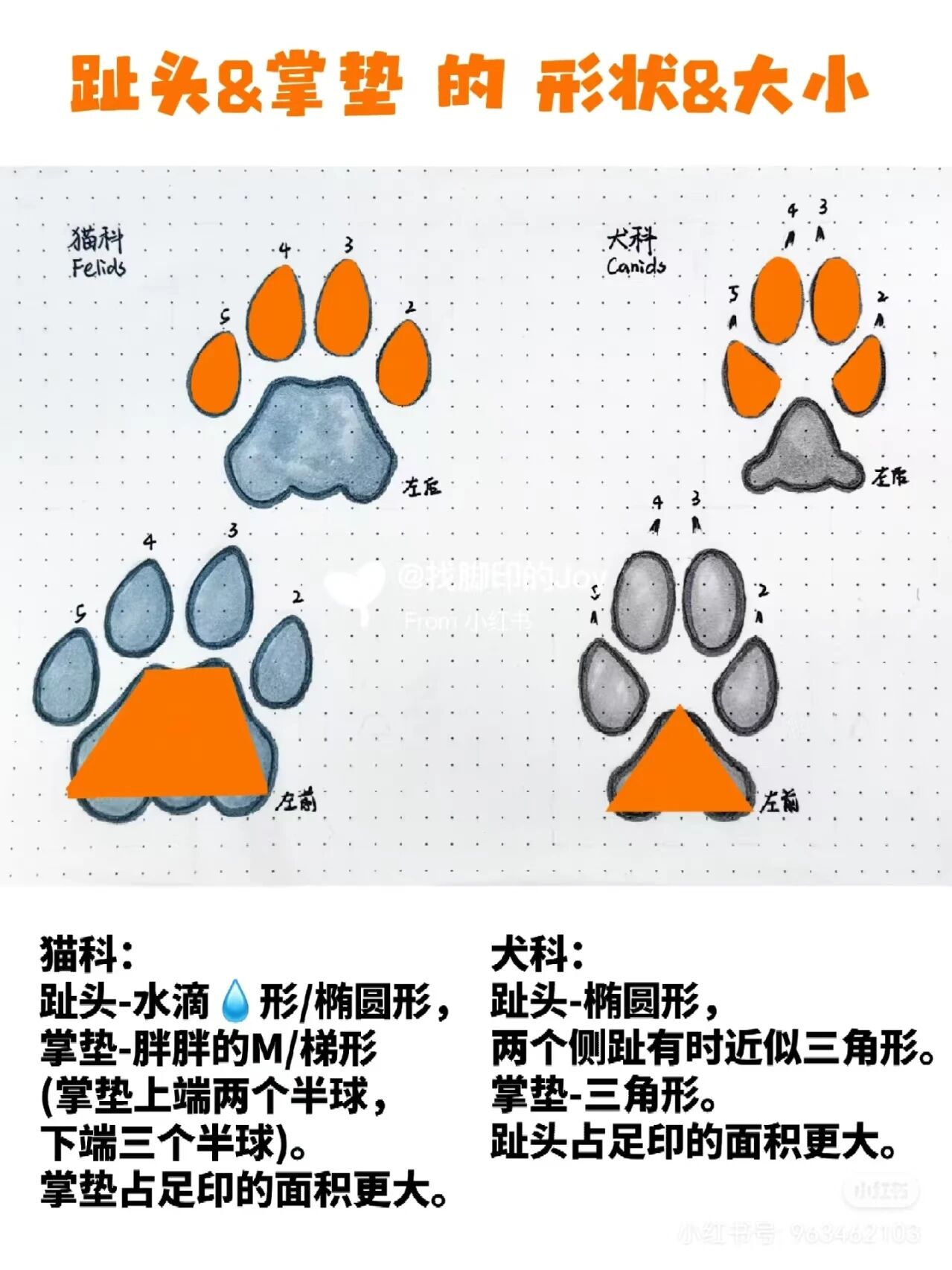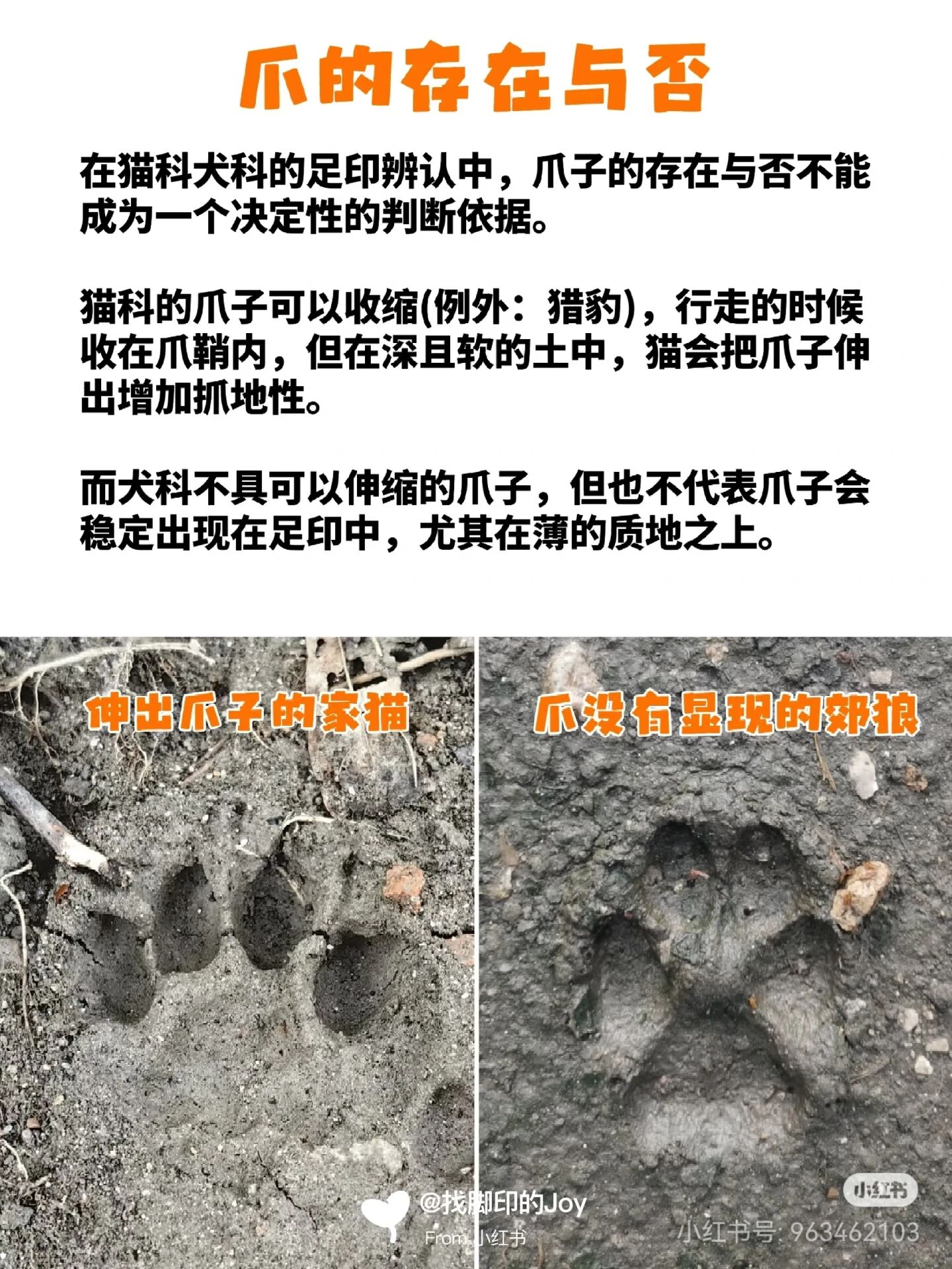 猫科、犬科脚印的辨识对比图,©小红书“找脚印的Joy”