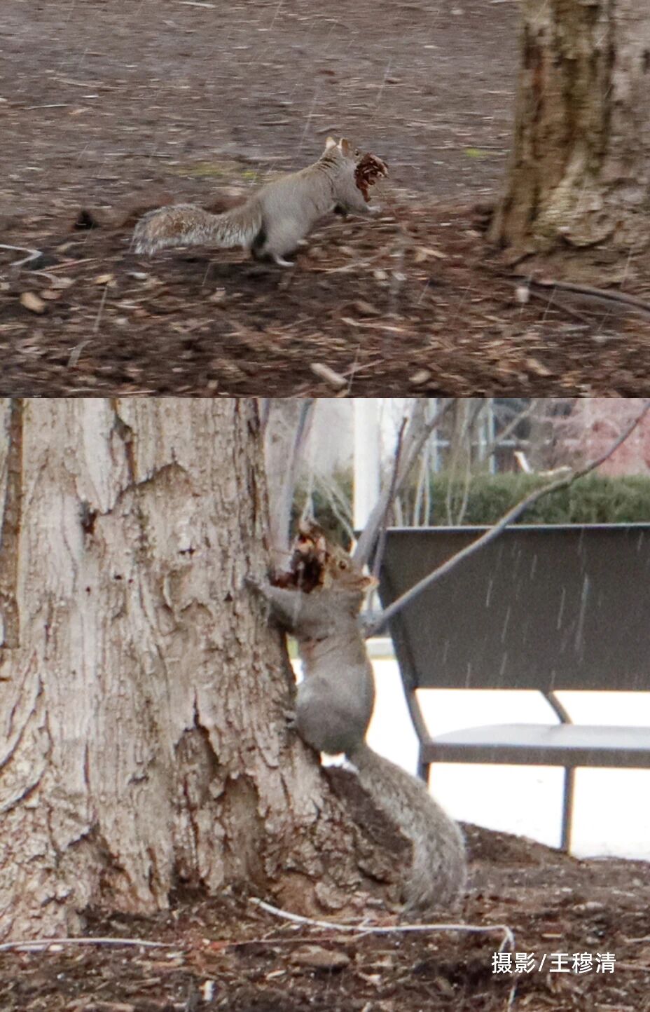 第四,如果能够四季连续观察,可以注意随着时间的推移,痕迹本身和物候有什么变化。最后,观察动物制造痕迹的过程,它可以帮助你确认某个痕迹确实是你所判断的动物。比如下图是一个松鼠窝。以喜鹊举例对比,喜鹊窝的外围用很多光秃秃的树枝,松鼠的则更多是带着枯叶的完整树枝,并且“就树取材”,银杏树上用银杏树叶,在水杉树上用水杉树叶,悬铃木树上又用悬铃木树叶……