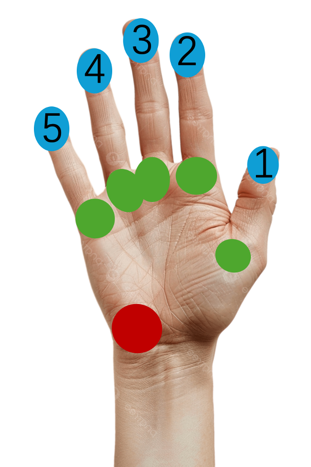 以人类手掌类比很多哺乳动物的脚底有肉垫,因为它们在陆地上走路需要缓冲。黄鼬前足底的肉垫有三类:1.指垫(只在指尖,不是覆盖整个指);2.掌垫(位置在掌骨末端);3.腕垫(前脚有,后脚没有)。除了有无腕垫,另一个判断前脚印还是后脚印的方法是,后脚的三四趾贴得更近。