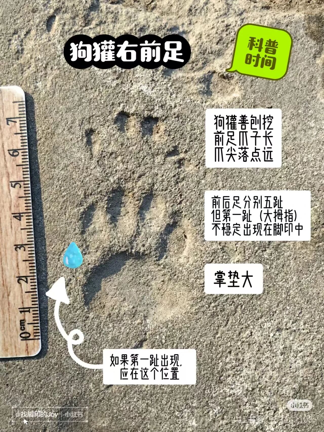 狗獾右前足的痕迹 ©小红书“找脚印的Joy”最后我们来说说如何区分猫科和犬科的脚印,猫狗的脚印是我们最容易接触到的,但误判率其实相当高。猫科和犬科的足印中都是四个趾垫、一个掌垫。如果大家周围有猫猫狗狗,可以把它们抱起来看一下——前足其实有五趾,但内侧的趾一已经退化为一个小突起,而后脚的已经彻底退化了。一个常被提到的区别是猫科动物能收缩爪子,而犬科不能,所以犬科的脚印有爪尖的痕迹。但要注意的是,在硬质或浅层地面上,犬科的爪印也可能不明显甚至不印出,猫科的爪也有可能在需要更大的抓地力时伸出,因此不能单凭有无爪印判断。