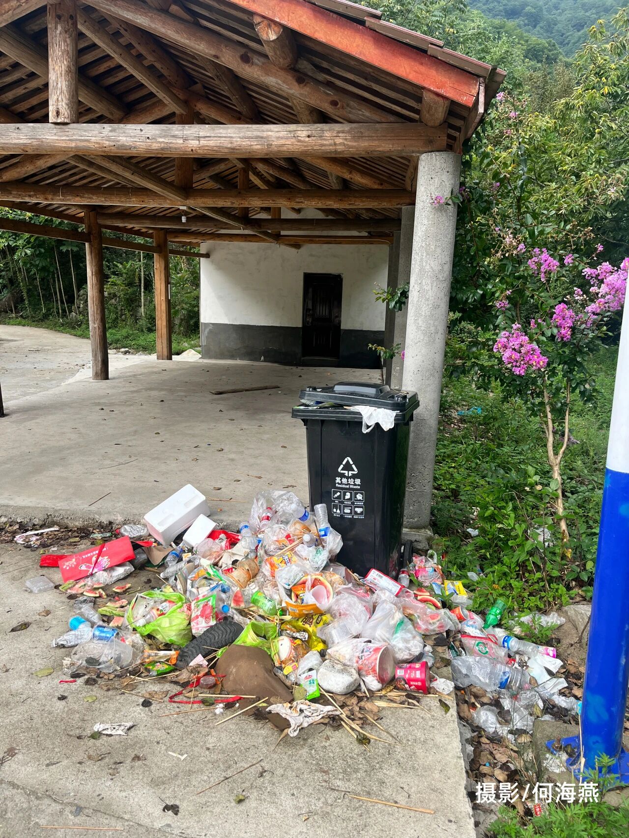 车子在水泥路的尽头停住,我们到达朝阳村13组,准备去往海波家[1]。下车后,几乎不用细看,就能发现一大片垃圾散落在垃圾桶旁边:带着汤水的自热火锅盒、泡面桶、烤焦的竹签、西瓜皮、各种零食塑料包装、尿不湿、各种各样干瘪的啤酒罐和饮料瓶,还有一些沾满油污的塑料碗筷和一次性杯子等等混杂在一起。稍走几步,还有更多零散的垃圾隐藏在桥头、树林和石头缝下。