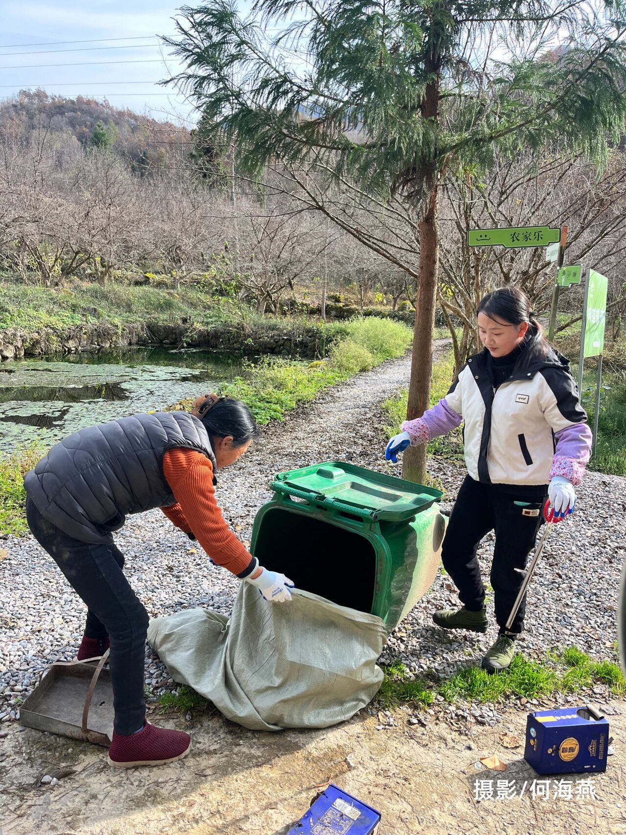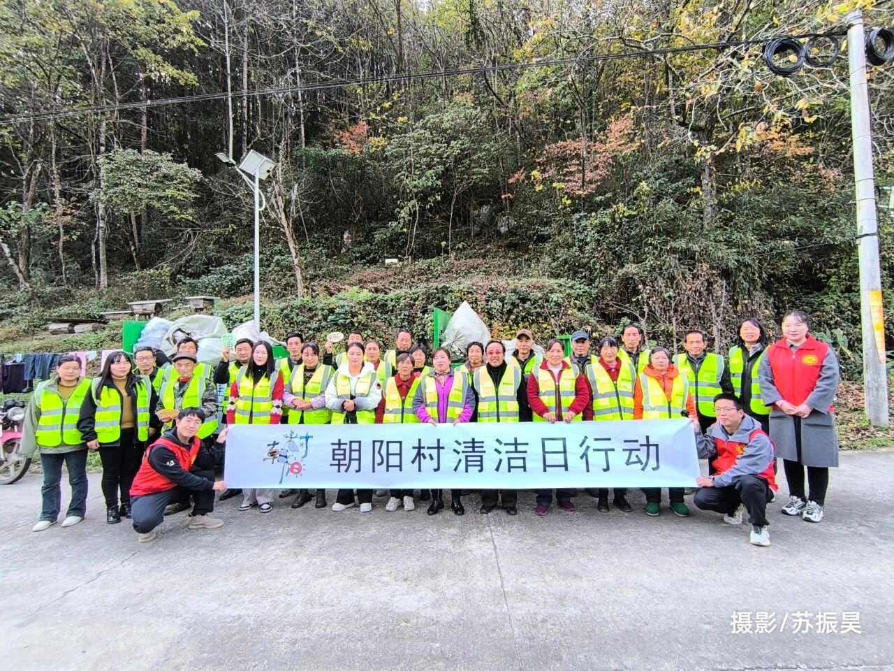 转折发生在11月初。我们再次进村,这次没有急着谈方案,而是先和村委、组长、公益岗村民坐在一起,聊聊垃圾到底带来了什么。大家从健康说起,谈到污染对水源、土壤的长期影响,谈到垃圾对大家健康的危害,也谈到整洁的环境如何让村庄更体面、更吸引人。基于这些共同的认知,清洁日的方案被重新打磨。时间定在11月20日-22日,分工明确到组、到人。组长负责动员本组村民,保护中心巡护员负责河道,公益岗村民分段打扫主路,两位村民志愿者专责清运,村委统筹村民以及与镇上协调。垃圾袋、火钳、马甲、宣传品也一一到组。工具在手,某种庄重的仪式感也悄然滋生,不少村民也意识到这不再是一次临时清扫,而是一次有组织的村庄行动。