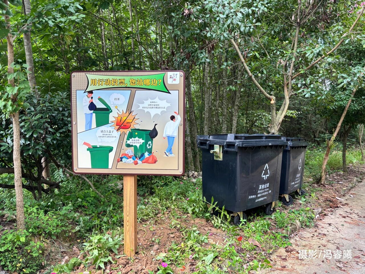 后续落成的环境解说牌之一暑假的七八月,重点区域的垃圾清运压力超出了朝阳村当前的清运能力,且游客依然存在乱扔垃圾的情况,但朝阳村已经不再像前一年那般被动应对,村委和保护中心参照“五一”垃圾突击行动,积极且连续地组织村民主动地对游客行为进行劝导和必要的垃圾管理,垃圾清运也配合着持续进行。虽然充满挑战和风险,但我们也感知到社区对垃圾管理的主体性正在逐渐强化,而这正是应对游客垃圾的底气。