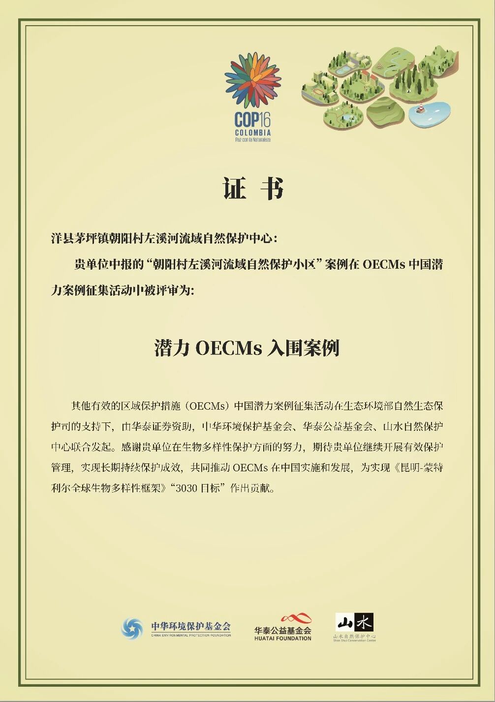 朝阳村第一次清洁日活动合影值得庆幸的是,垃圾并非山水与朝阳村对话的唯一议题,山水支持的生态保护工作也在推进,朝阳保护小区从两个组扩展到五个组,将几个垃圾问题突出的区域也纳入了保护范围。这使得垃圾治理的责任与生态保护的权责更紧密地结合。2024年11月,朝阳保护小区入选“中国潜力OECMs入围案例”,海波代表村子前往北京领此荣誉。来自外部的认可与关注,不仅赋能了海波个人,也让整个社区看到,他们在垃圾问题上的点滴努力同样是全球生态保护叙事的一部分。这条并行的轨道,为垃圾治理工作提供了更深厚的意义感和持续的动力。