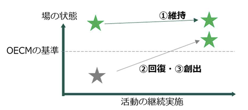 从“场所”到“活动”的扩展: 新法旨在认证“生物多样性增进活动”,即维持、恢复或创造生物多样性的活动实施计划。这不仅包含维持现有生物多样性丰富的场所的努力(自然保护地外部分可作为OECM注册到国际数据库中) ,也包括在目前生态价值不明显的区域实施的生物多样性恢复或创造活动,这些区域如果生物多样性状况改善后达到OECM的基准,则可以注册为OECM,录入国际数据库。